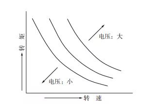 如下图所示,串励电机中励磁线圈与电枢线圈的电流相同,所以不能像他励或并励电机那样,独立控制各部分的线圈电流。图中表示的是串励电机转速与转矩的关系。串励电机只可控制一个电压,不同电压下的特征表现如图所示。