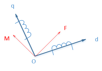 再进一步,我们假定有一个两相正交的对称绕组,分别通以直流电流 Id 、Iq,他们产生的合成磁动势和两相静止坐标系及三相静止坐标系完全相等,且两相正交绕组以磁场同样的角速度旋转,那么 d、q 旋转坐标系和前面的三相静止以及两相静止就可以完全等效,这就是两相静止到两相旋转坐标系的变换。