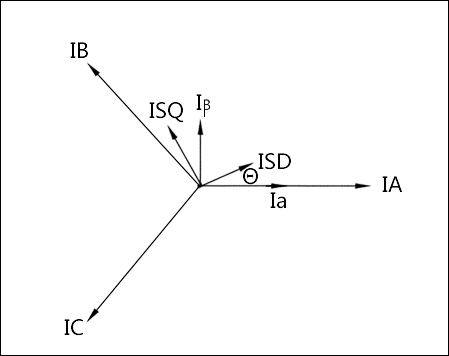 Clarke变换采用三相电流IA, IB 以及 IC,这两个在固定座标定子相中的电流被变换成Isd 和Isq,成为Park变换d, q中的元素。其通过电机通量模型来计算的电流Isd, Isq 以及瞬时流量角θ被用来计算交流感应电机的电动扭矩。