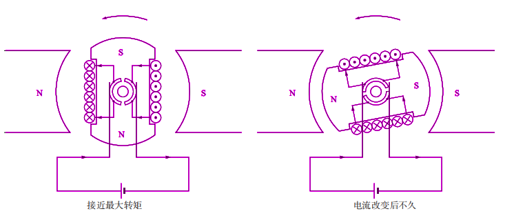 上图中,电流沿箭头方向流动,线圈上为S极,下为N极,根据异性相吸、同性相斥的原理,电枢逆时针转动,当电枢旋转90°时,磁极就会变换,即S极变成N极,N极变成S极,使电枢继续朝逆时针转动。