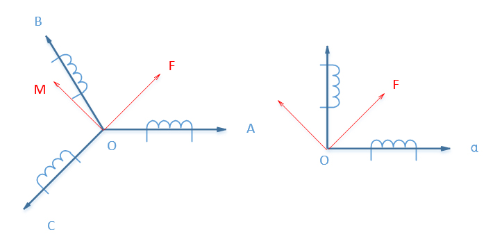 三相绕组产生的磁场和力矩同两相正交绕组产生的磁场和力矩的大小、方向完全相等,并且以同样的角速度在空间逆时针旋转,形成同样的旋转磁场。这就是常说的三相静止坐标系到两相静止坐标系的变换。